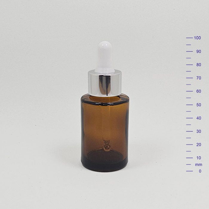 BOTELLA ROUND GLASS 30 cc AMBAR c/PIPETA PLATA BRILLO (240)